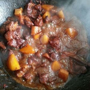 锅中水开始咕嘟时,此时放入土豆,然后加入热水,没过土豆和五花肉,中小火炖25-30分钟即可出锅,出国前放入一勺鸡精提味