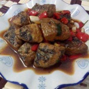 锅内留少许油,煸香葱姜米、红辣椒,放入臭豆腐、料酒、蚝油、糖、生抽、清水,烧至入味加入鸡精即可。