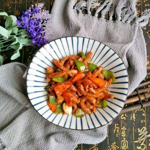 锅中留底油,倒入胡萝卜、青椒、蒜瓣翻炒。