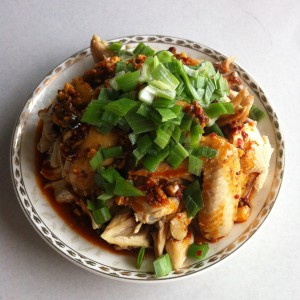冰镇好的鸡肉捞出,沥干水分,剁成小块,把调好的汁子浇上,就好了。