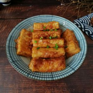 锅里放油,油温6成热的时候,把豆腐放进去,炸制两面金黄,一定要小火炸,不然会糊了。