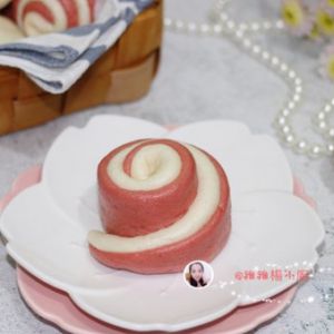 把两个颜色一分为二,一个用红色的面皮在下,一个用白色面皮在下,这样两个卷出来的花色就不一样了,这个可按个人喜好,将两块面团重叠起来,用擀面杖轻轻按压,擀平,使两块面皮完全重叠。在重叠的面皮上抹上一点点水,尽量的抹均匀一点,这一步是不可以忽略的,至于重叠顺序没有规定