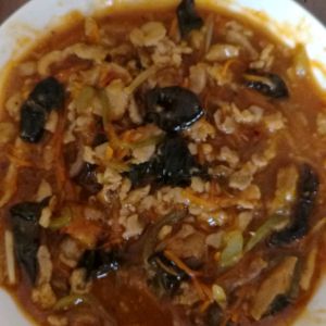 8.倒入胡萝卜丝,青椒丝翻炒一会儿,再倒木耳味,肉丝,调味汁,翻炒1分钟。