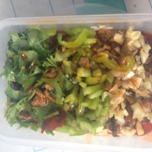 装盘,放入蒜,香菜,青椒…吃的时候拌一下,因为我要外带所以装保鲜盒里了,