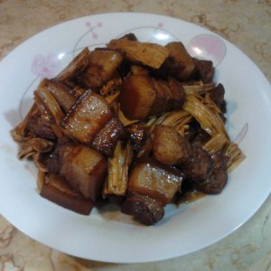 放入煮好的五花肉,加入半碗清水莫过五花肉,然后放入适量老抽、少许米酒,盖上锅盖闷煮15分钟。