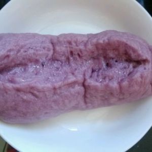 准备好材料,紫薯我是用差不多2小块,这个可以自己随意添加,把紫薯蒸熟压成泥放凉,面粉放入大碗里,再放入紫薯泥,盐,糖,酵母和水混合(水量要根据面粉的吸水量适当的调整)