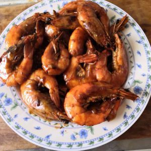 放料酒,盐,糖,醋,酱油调味,放的多少可根据个人喜好口感偏重,我放的盐,糖,醋,酱油都不多,虾的外壳味道正好,肉味道稍淡,盖盖焖煮一会,汤汁不多时,开盖翻炒,使汁均匀分布