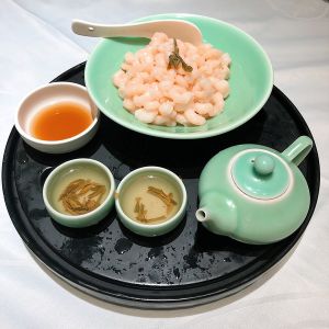 另起锅,把滤干的虾仁放入锅内,倒入泡好的龙井茶莫过虾仁继续熬煮