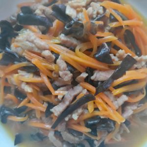 准备食材:里脊肉切条用生粉,酱油腌制15分钟。胡萝卜刨丝,木耳泡发后切丝