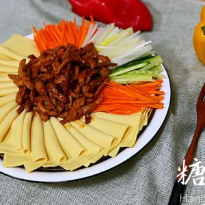 胡萝卜,大葱,黄瓜切丝摆盘,千张摆盘