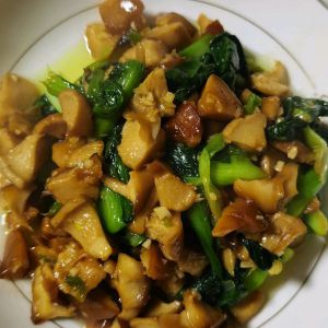 热锅冷油加入油菜翻炒两分钟,加入提前焯好水的香菇,加入两勺耗油,一勺酱油,适量盐,鸡精,十三香,蒜末翻炒均匀出锅。