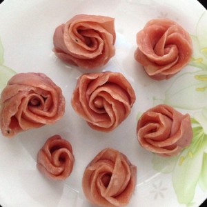 用温水加酵母粉,搅拌均匀,和火龙果水一起倒入面粉,和面。完后,隔碗放入温水半小时等面发酵。