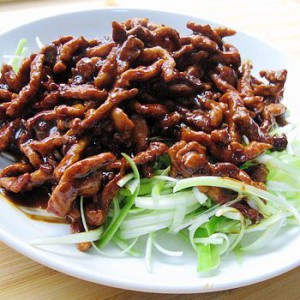 放入肉丝,翻炒至每根肉丝都挂满酱汁。盛出放到葱丝上面即可。