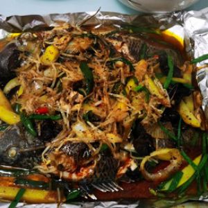 罗非鱼清洗干净,肚子里黑色膜去掉,划十字,料酒,盐少许腌制。