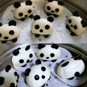取出一小块黑面团擀薄了,用圆口裱花嘴的大头部分刻出熊猫的耳朵,从中间切两半就变成小耳朵。用小头来克熊猫的眼睛,再搓个长条切小段,搓圆了来做熊猫的腿,再搓一个更细的来做熊猫的尾巴和鼻子