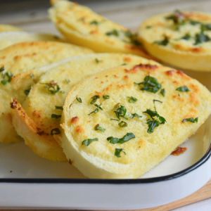 黄油蒜泥刷在馒头片上,撒上香菜和葱花碎