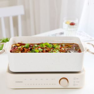 颜值超高的康佳多功能锅,主机平板还可以搭配家里的其他锅具,特别方便。一个深盘,一个煎盘,都是食品级不沾涂层,使用安全放心,易清洗。