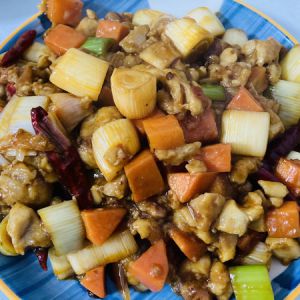 倒入干辣椒,鸡丁,调好的淀粉水翻炒半分钟