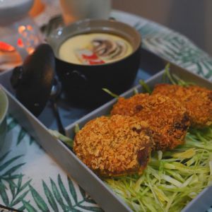 最后炸好直接出锅,可以挤上番茄酱或者蛋黄口味的丘比酱~ 摆盘好看切点圆白菜就行了