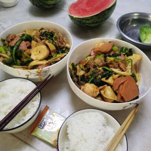 把蔬菜、蘑菇都洗好,大虾剔去虾线,午餐肉切片,粉丝类提前泡好。