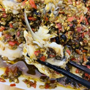 把炒好的佐料舀在鱼头上,蒸8分钟。