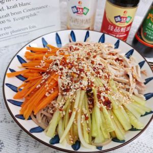 胡萝卜,黄瓜切丝焯水煮熟,鸡胸肉撕成丝