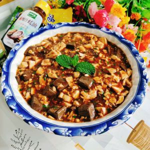嫩豆腐和鸭血清洗一下,切成小块,蒜瓣剁成蒜末,生姜切成小丁,干辣椒切成段备用!