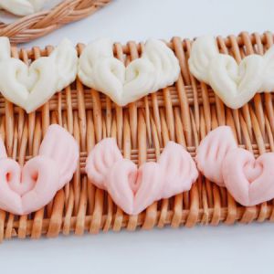 压好的面片直接用模具刻出圆形,中心处开始切三条,但是不要切断。两边的部分用勺子画3下,最后做天使翅膀的造型(请反复观看整形部分))