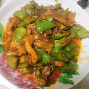 倒入青椒,继续翻炒,加入生抽,老抽,翻炒均匀。出锅前来点白糖提现。关火乘出