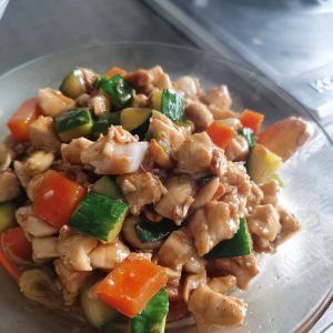 热锅凉油倒入鸡丁翻炒变熟出锅备用