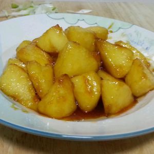 油锅烧热,放入白砂糖两勺。等熬成糖浆,下入苹果块。不停翻滚,待苹果全部裹上一层糖色盛出。完成了!