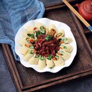 将肉丝放入盘中间,吃的时候取一个豆腐皮夹上一筷子肉丝一起入口。豆腐皮和葱、蔬菜的清香正好中和了肉的油腻。