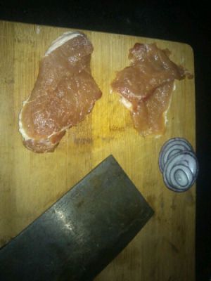 1肉切片,洋葱切片,分开切勿混切。注意事项,肉上切平行切口,涂抹少量盐巴,白酒腌制。