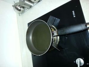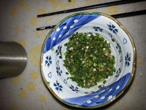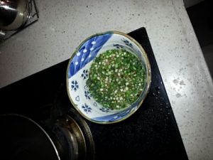 把油倒入拌匀好后的葱碗中