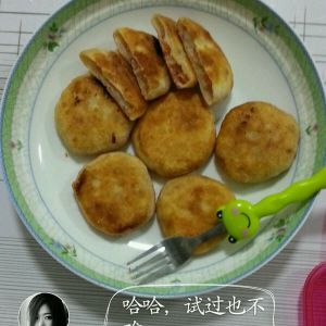 把饧好的面团用包包子的方法把包好的包子按成饼形煎好,OK了。