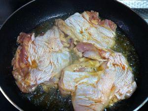 鸡腿 去骨 我是提前腌制一天的 这样更入味 鸡腿放入平底锅煎至两面焦黄 8成熟