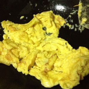锅里热油,8成热时,倒入鸡蛋,用铲子搅成块,盛出备用。