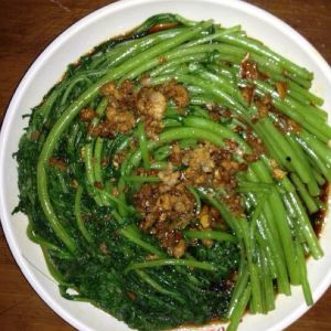 蒜出香味后放入肉沬,放一点点盐!然后放生抽!