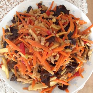 泡发的木耳,胡萝卜,茭白切成丝。葱姜蒜切末。取一小碗,入糖盐料酒生抽醋。少许水,淀粉。调成汁。