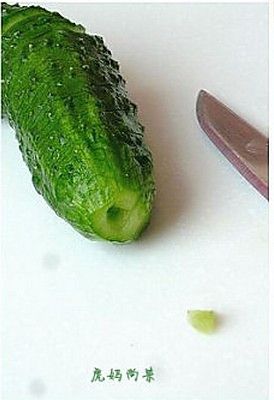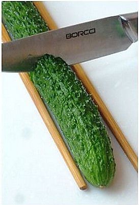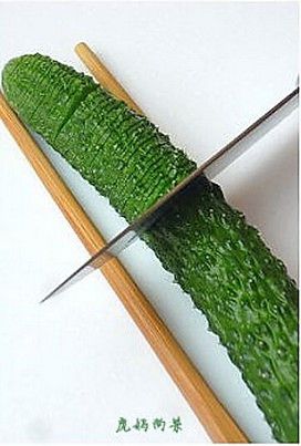 将黄瓜均匀的切成不断掉的片。可以用两根筷子与黄瓜一起平行放置,这样垫着切黄瓜会阻隔刀落到底部,黄瓜也就不会切断。