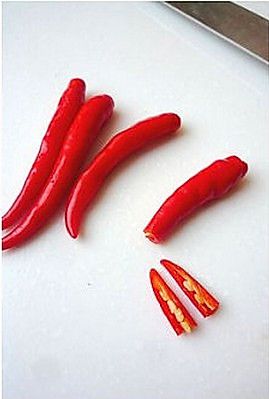 将其中一个的红色小米椒切掉尖部,然后再剖开,去掉里面的辣椒籽,这就是小蛇的信子了。