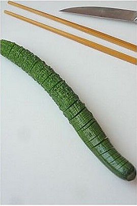 切好一面,然后将黄瓜翻过来再切另一面,180度的翻面。切这一面要将刀稍稍的倾斜,与上一面错开,免得将黄瓜切断。片切的越薄越均匀,做出来的小蛇就越柔软。