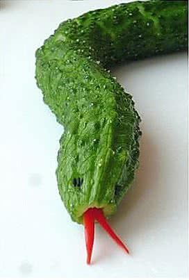 在黄瓜的顶部切掉一片,并用小号的尖刀挖个小洞,就当小蛇的嘴。然后再在上面对称的两边各挖个小一点的洞,做眼睛用。