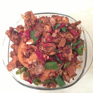 一直翻炒直干辣子香味出来,下姜片,葱段,青辣子,花椒,干炒至香味出来,加盐后炒至入味,土鸡比较难入味。