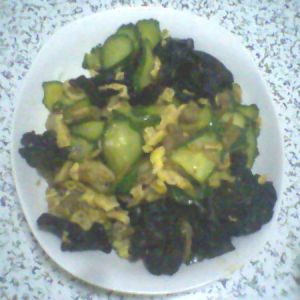 倒入鸡蛋木耳,翻炒,适量的加水