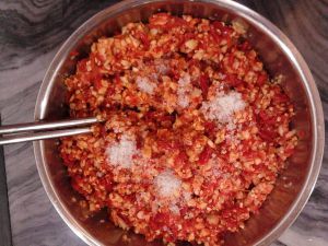 蒜蓉辣椒混在一起 洒上盐和白沙糖搅均匀备用,