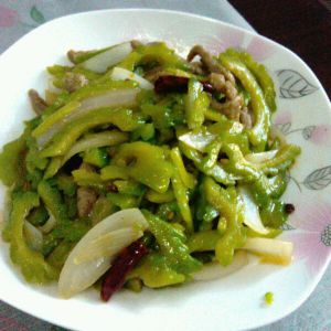 锅中再入油油热倒入葱段花椒干辣椒洋葱炒香倒入苦瓜,加盐,十三香,生抽翻炒均匀倒入肉丝,翻炒均匀,因为食材都是熟的,所以只要洋葱熟了即可关火盛出。