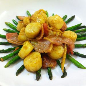 炒锅加热 倒橄榄油 三分热时放姜丝和芦笋,然后倒入鲜贝,加烧烤酱和蚝油,顺便把烤熟的培根撕碎一起翻炒。这个过程我用的都是中小火。
