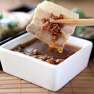 蒜用压蒜钳压成泥,与香油2大勺、生抽2大勺、糖1小勺、盐少量、辣椒红油2大勺、醋1小勺混合为味汁