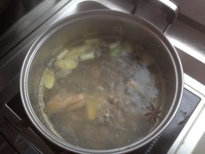 锅中放水,烧开后放入晾好的鸡,葱姜蒜,八角,枸杞。